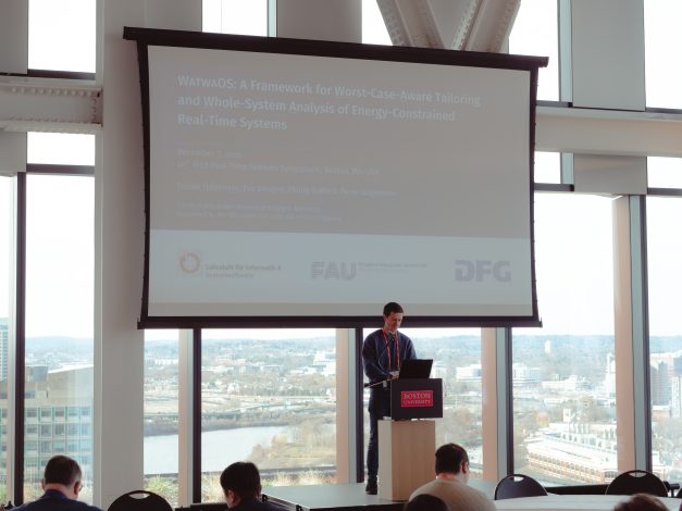 6. Dezember 2025 Das Real-Time Systems Symposium (RTSS), die führende Tagung im Bereich Echtzeitsysteme, fand von 2. bis 5. Dezember in Boston, Massachusetts, statt. Die Embedded Systems Software Gruppe war mit zwei Veröffentlichungen auf dieser Veranstaltung vertreten: Zum einen wurde die gemeinsame Arbeit der TU Dortmund und der FAU mit dem Titel „Dynamic Fuzzing-Based Whole-System Timing Analysis“ von Alwin Berger (TU Dortmund) präsentiert. Weiterhin hielt Tobias Häberlein den Vortrag zur Veröffentlichung „WatwaOS: A Framework for Worst-Case–Aware Tailoring and Whole-System Analysis of Energy-Constrained Real-Time Systems“, die Teil des von der DFG geförderten Forschungsprojekts Watwa ist. Für seinen Vortrag erhielt Tobias den Best Presentation Award. Herzlichen Glückwunsch, Tobias! Kategorie: Eingebettete Systemsoftware, Konferenz, News